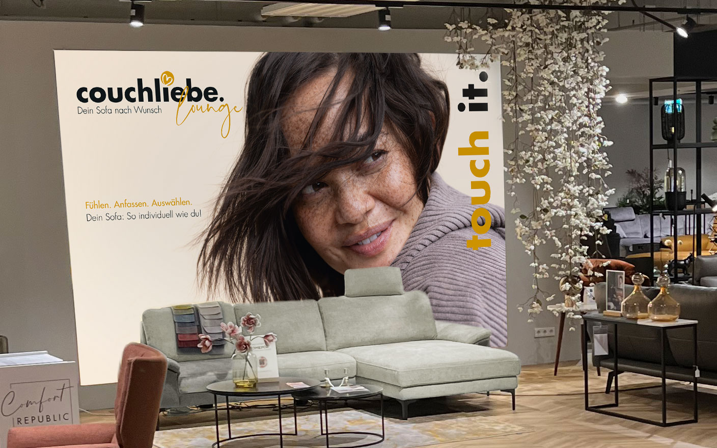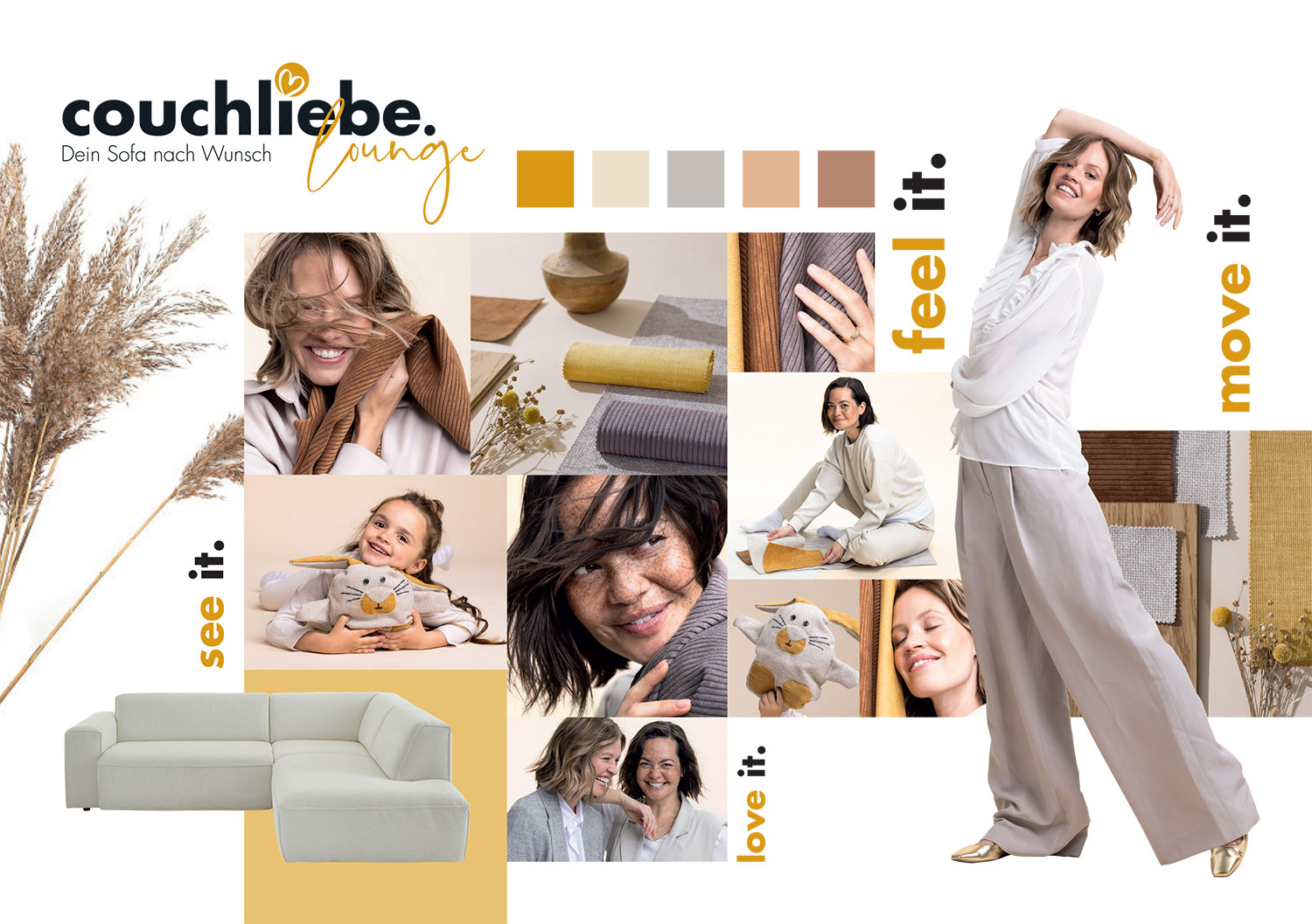 Gestalterisch verbindet Couchliebe Lounge modernen Komfort mit einem Hauch Boho-Chic. Warme Naturtöne, weiche Stoffe und eine ruhige, natürliche Bildsprache schaffen eine Atmosphäre von Leichtigkeit und Geborgenheit. Sofas werden nicht als Produkt gezeigt, sondern als Ort – für Ruhe, Nähe und gemeinsame Momente.